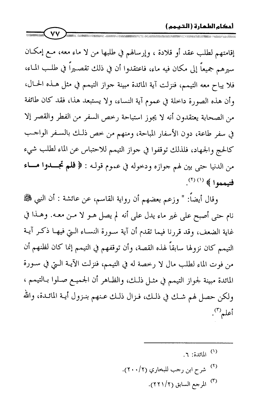 وقال أيضاً: " وزعم بعضهم أن رواية القاسم، عن عائشة: أن النبي - صلى الله عليه وسلم - نام حتى أصبح على غير ماء يدل على أنه لم يصل هو لا من معه. وهذا في غاية الضعف، وقد قررنا فيما تقدم أن آية سورة النساء التي فيها ذكر آية التيمم كان نزولها سابقاً لهذه القصة، وأن توقفهم في التيمم إنما كان لظنهم أن من فوت الماء لطلب مال لا رخصة له في التيمم، فنزلت الآية التي في سورة المائدة مبينة لجواز التيمم في مثل ذلك، والظاهر أن الجميع صلوا بالتيمم، ولكن حصل لهم شك في ذلك، فزال ذلك عنهم بنزول أية المائدة، والله أعلم (¬3).