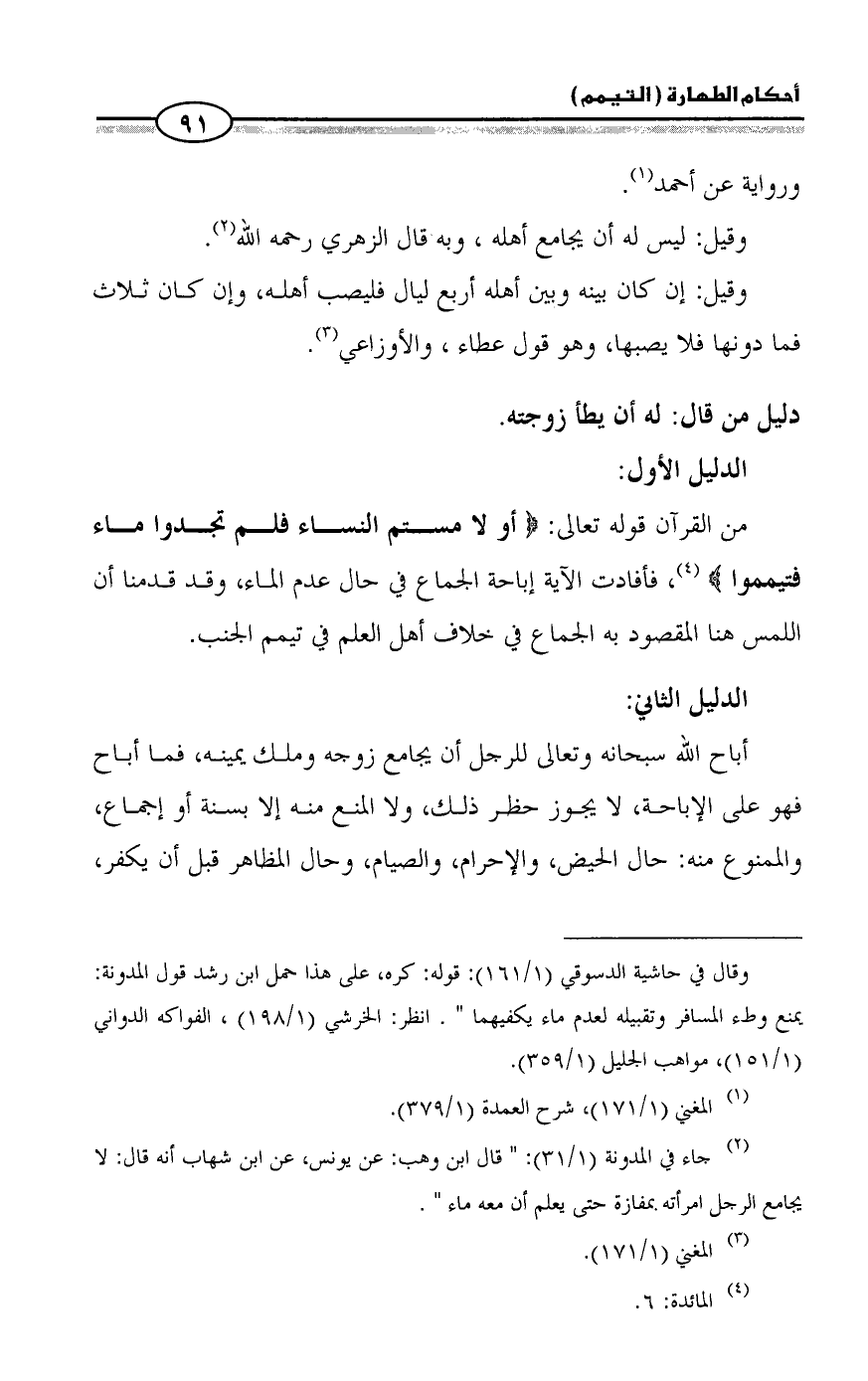 = وقال في حاشية الدسوقي (1/ 161): قوله: كره، على هذا حمل ابن رشد قول المدونة: يمنع وطء المسافر وتقبيله لعدم ماء يكفيهما ". انظر: الخرشي (1/ 198)، الفواكه الدواني
