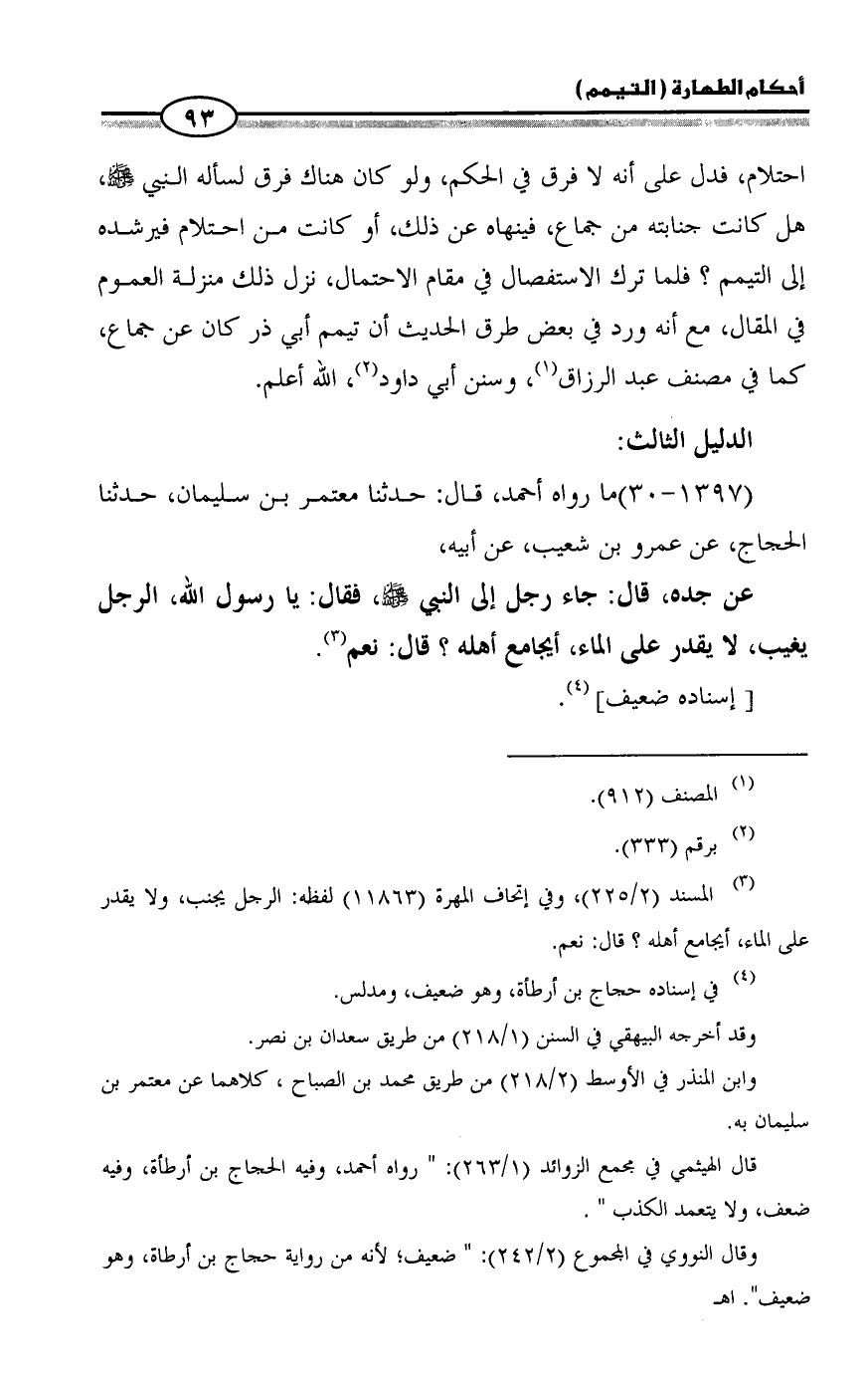 عن جده، قال: جاء رجل إلى النبي - صلى الله عليه وسلم -، فقال: يا رسول الله، الرجل يغيب، لا يقدر على الماء، أيجامع أهله؟ قال: نعم (¬3).