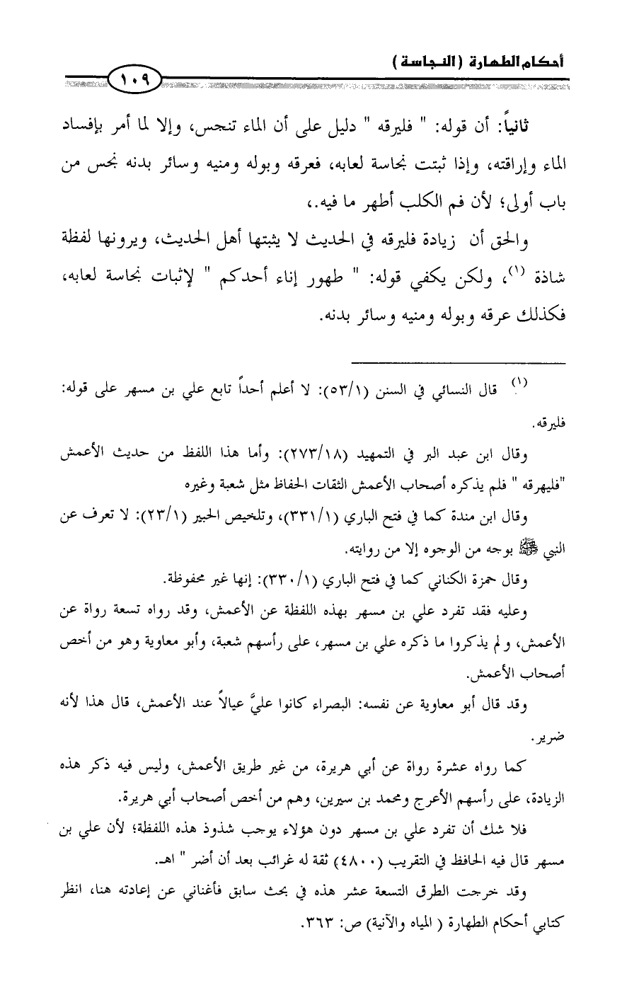 (¬1) قال النسائي في السنن (1/ 53): لا أعلم أحداً تابع علي بن مسهر على قوله: فليرقه.
