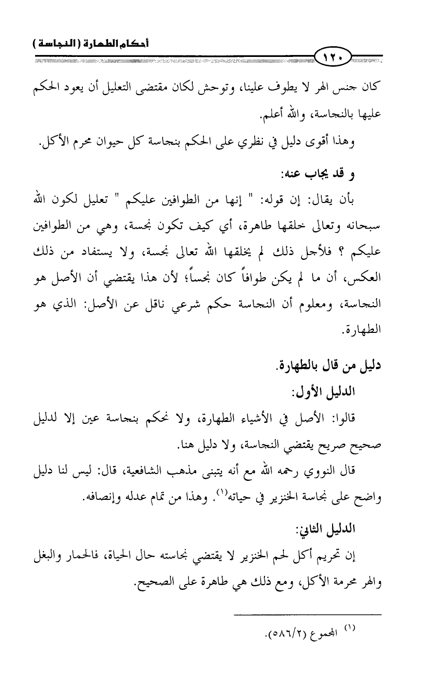 قال النووي رحمه الله مع أنه يتبنى مذهب الشافعية، قال: ليس لنا دليل واضح على نجاسة الخنزير في حياته (¬1). وهذا من تمام عدله وإنصافه.