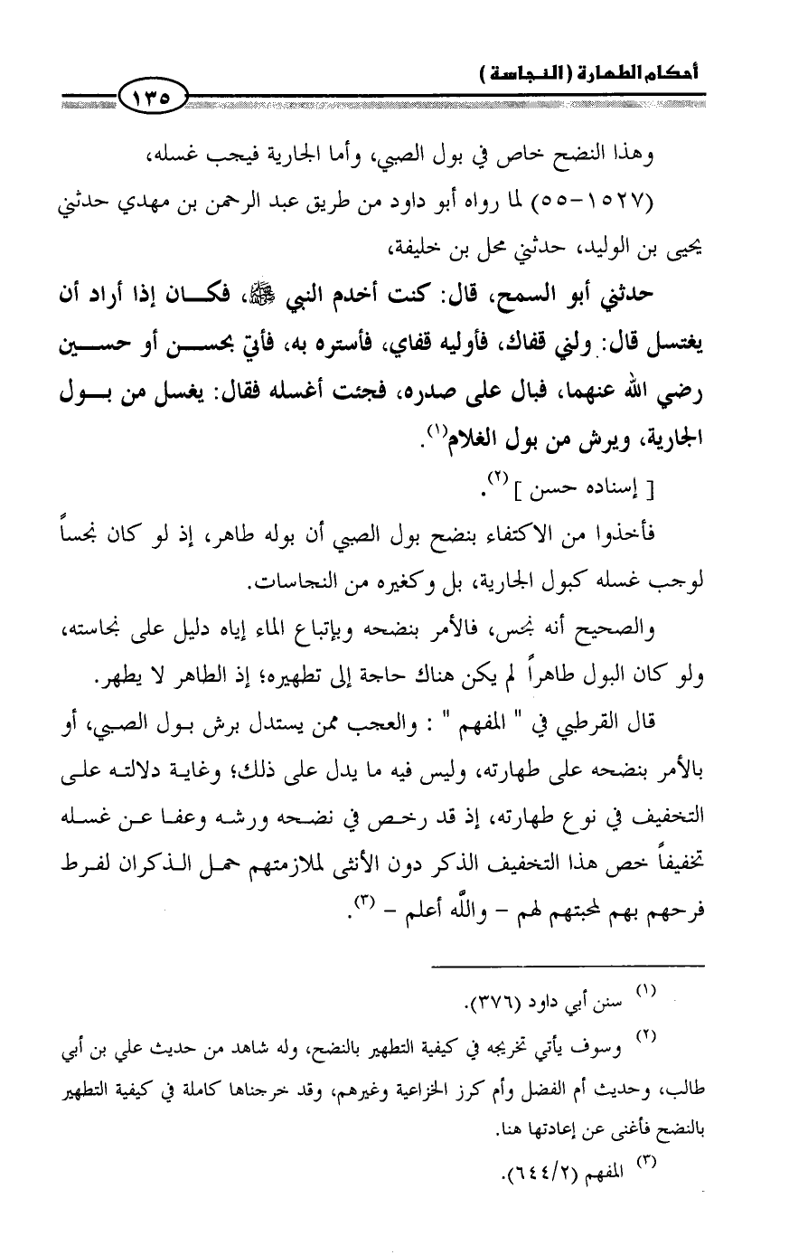 قال القرطبي في " المفهم ": والعجب ممن يستدل برش بول الصبي، أو بالأمر بنضحه على طهارته، وليس فيه ما يدل على ذلك؛ وغاية دلالته على التخفيف في نوع طهارته، إذ قد رخص في نضحه ورشه وعفا عن غسله تخفيفاً خص هذا التخفيف الذكر دون الأنثى لملازمتهم حمل الذكران لفرط فرحهم بهم لمحبتهم لهم - واللَّه أعلم - (¬3).