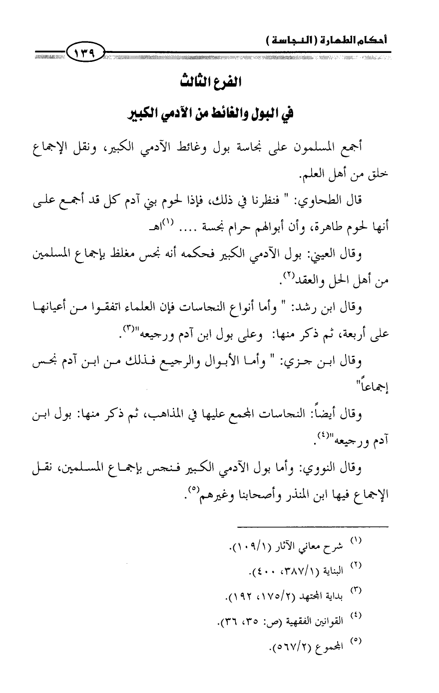 وقال ابن رشد: " وأما أنواع النجاسات فإن العلماء اتفقوا من أعيانها على أربعة، ثم ذكر منها: وعلى بول ابن آدم ورجيعه" (¬3).