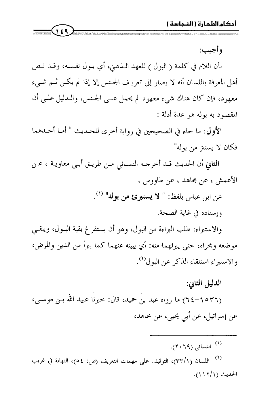 بأن اللام في كلمة (البول) للعهد الذهني، أي بول نفسه، وقد نص أهل المعرفة باللسان أنه لا يصار إلى تعريف الجنس إلا إذا لم يكن ثم شيء معهود، فإن كان هناك شيء معهود لم يحمل على الجنس، والدليل على أن المقصود به بوله هو عدة أدلة: