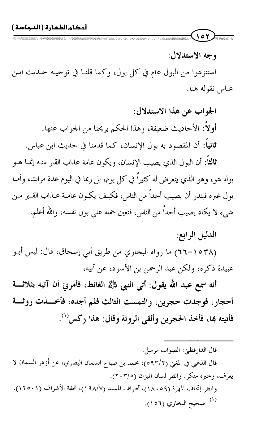 ثالثاً: أن البول الذي يصيب الإنسان، ويكون عامة عذاب القبر منه إنما هو بوله هو، وهو الذي يتعرض له كثيراً في كل يوم، بل ربما في اليوم عدة مرات، وأما بول غيره فيندر أن يصيب أحداً من الناس، فكيف يكون عامة عذاب القبر من شيء لا يكاد يصيب أحداً من الناس، فتعين حمله على بول نفسه، والله أعلم.