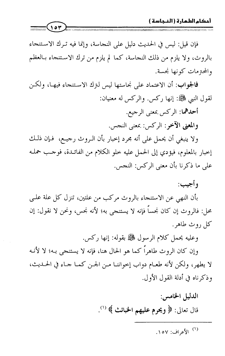 فإن قيل: ليس في الحديث دليل على النجاسة، وإنما فيه ترك الاستنجاء بالروث، ولا يلزم من ذلك النجاسة، كما لم يلزم من ترك الاستنجاء بالعظم والمحترمات كونها نجسة.