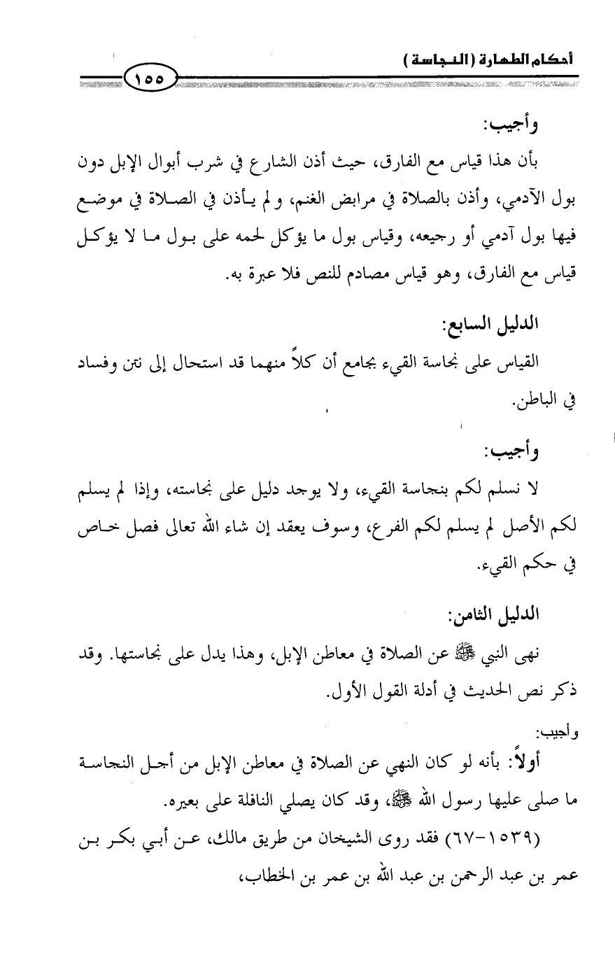 بأن هذا قياس مع الفارق، حيث أذن الشارع في شرب أبوال الإبل دون بول الآدمي، وأذن بالصلاة في مرابض الغنم، ولم يأذن في الصلاة في موضع فيها بول آدمي أو رجيعه، وقياس بول ما يؤكل لحمه على بول ما لا يؤكل قياس مع الفارق، وهو قياس مصادم للنص فلا عبرة به.