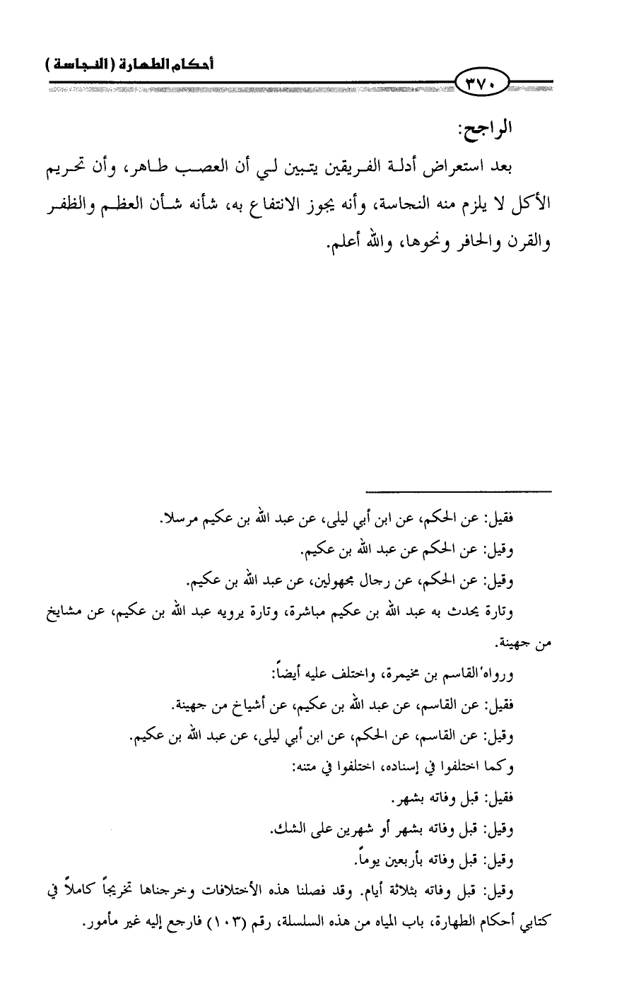 بعد استعراض أدلة الفريقين يتبين لي أن العصب طاهر، وأن تحريم الأكل لا يلزم منه النجاسة، وأنه يجوز الانتفاع به، شأنه شأن العظم والظفر والقرن والحافر ونحوها، والله أعلم.