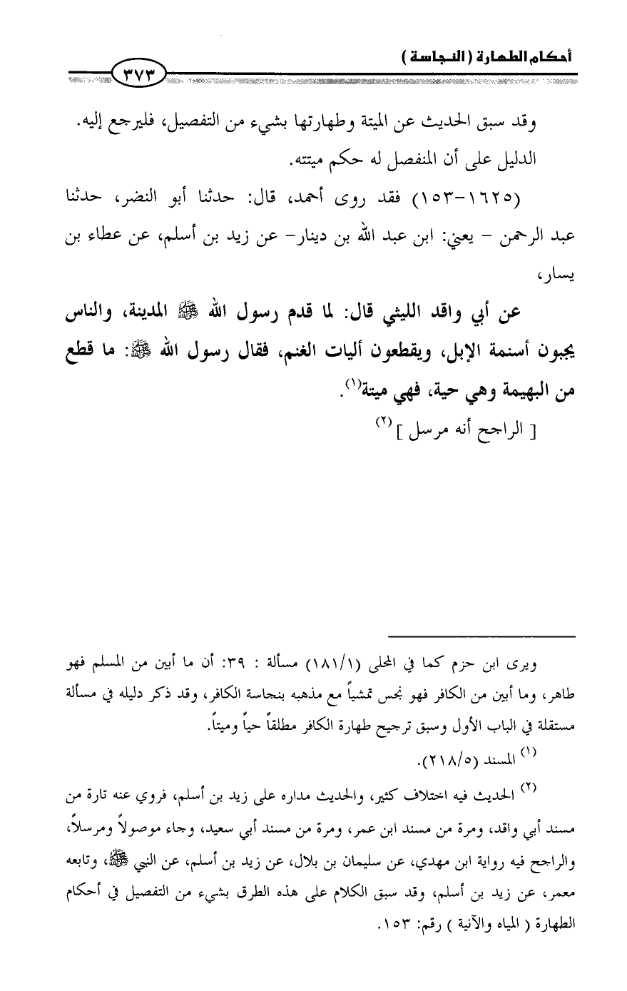 (¬2) الحديث فيه اختلاف كثير، والحديث مداره على زيد بن أسلم، فروي عنه تارة من مسند أبي واقد، ومرة من مسند ابن عمر، ومرة من مسند أبي سعيد، وجاء موصولاً ومرسلاً، والراجح فيه رواية ابن مهدي، عن سليمان بن بلال، عن زيد بن أسلم، عن النبي - صلى الله عليه وسلم -، وتابعه معمر، عن زيد بن أسلم، وقد سبق الكلام على هذه الطرق بشيء من التفصيل في أحكام الطهارة (المياه والآنية) رقم: 153.