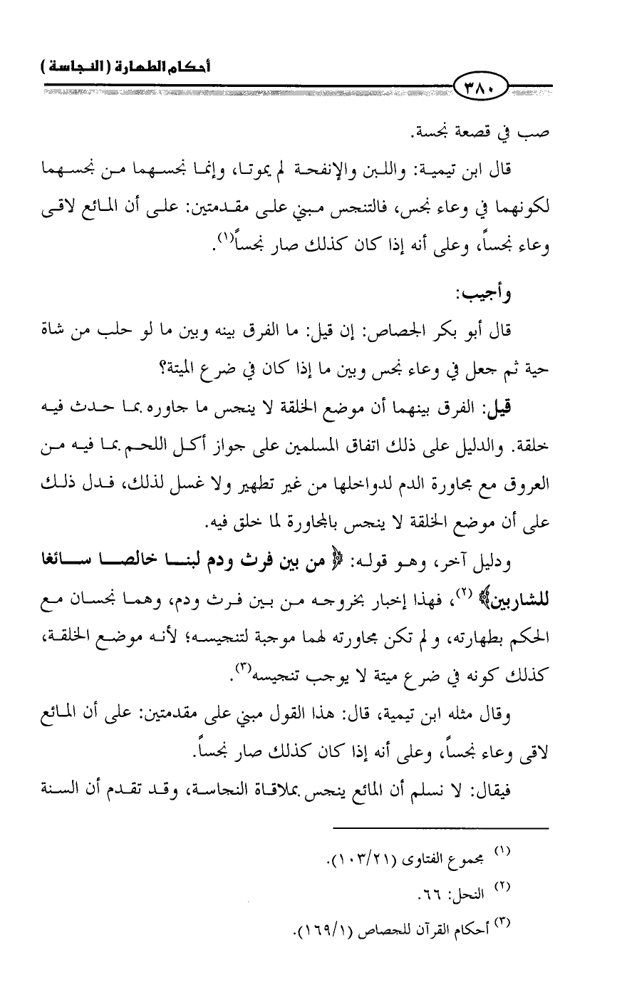 قال ابن تيمية: واللبن والإنفحة لم يموتا، وإنما نجسهما من نجسهما لكونهما في وعاء نجس، فالتنجس مبني على مقدمتين: على أن المائع لاقى وعاء نجساً، وعلى أنه إذا كان كذلك صار نجساً (¬1).