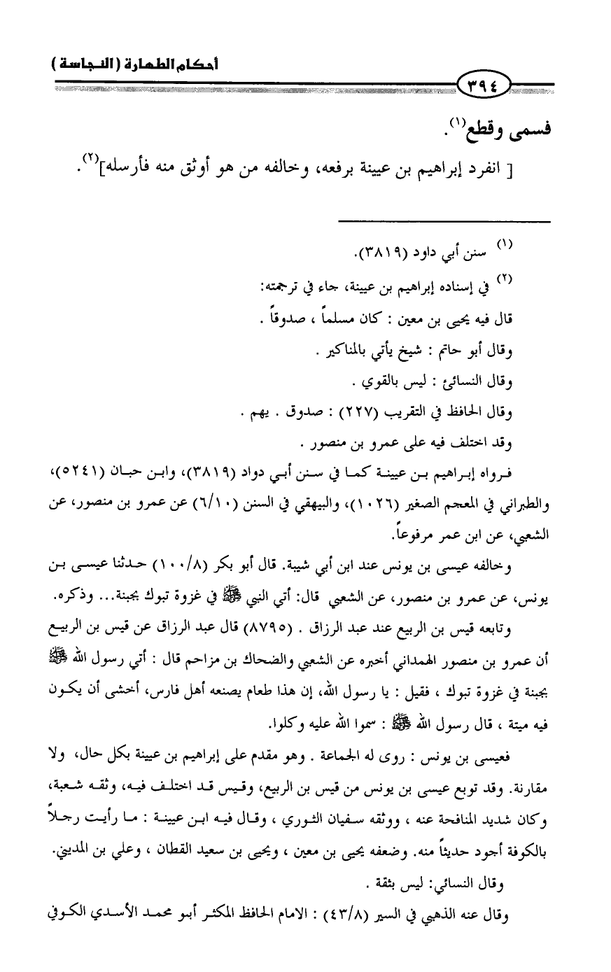 فعيسى بن يونس: روى له الجماعة. وهو مقدم على إبراهيم بن عيينة بكل حال، ولا مقارنة. وقد توبع عيسى بن يونس من قيس بن الربيع، وقيس قد اختلف فيه، وثقه شعبة، وكان شديد المنافحة عنه، ووثقه سفيان الثوري، وقال فيه ابن عيينة: ما رأيت رجلاً بالكوفة أجود حديثاً منه. وضعفه يحيى بن معين، ويحيى بن سعيد القطان، وعلي بن المديني.
