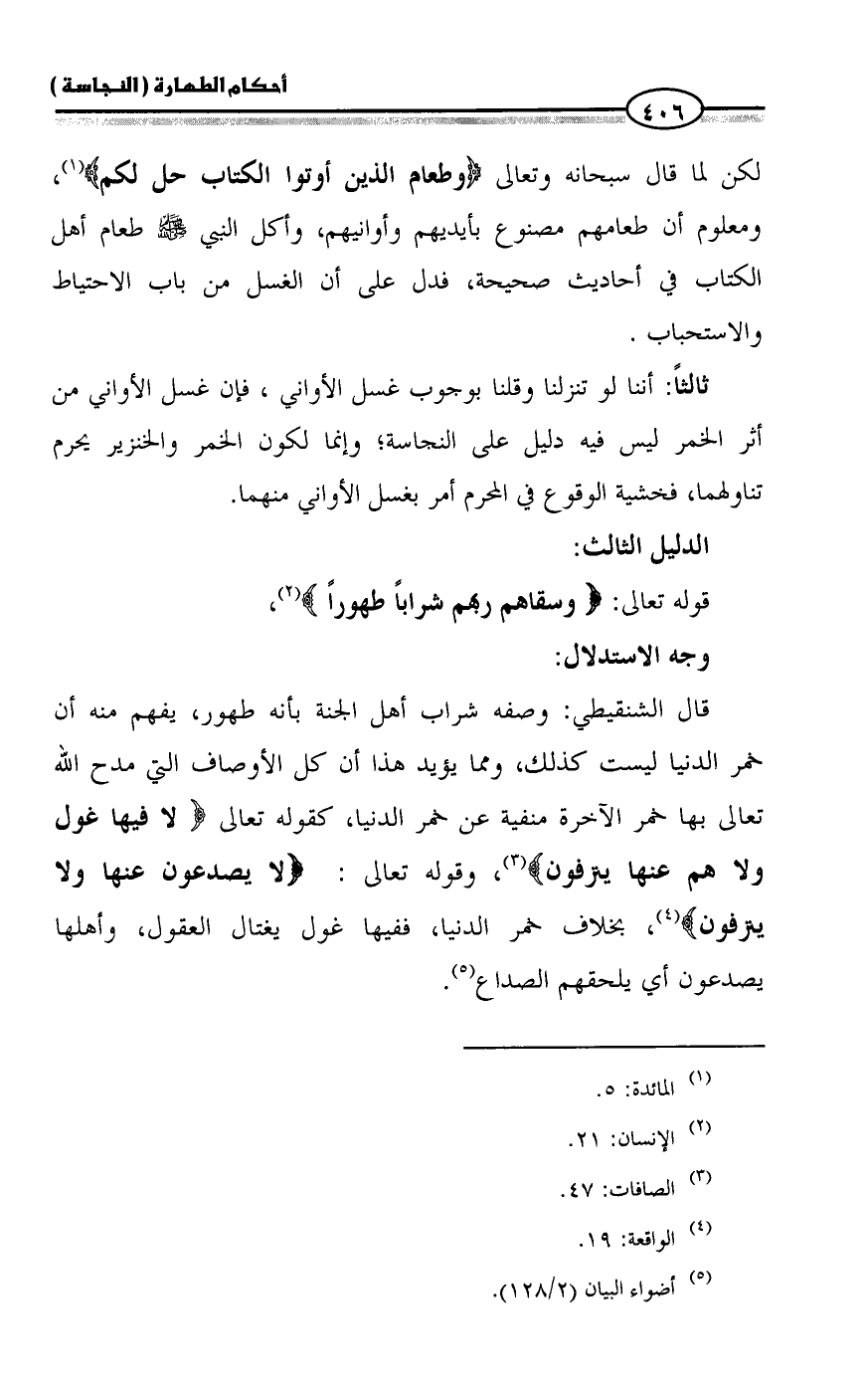 قال الشنقيطي: وصفه شراب أهل الجنة بأنه طهور، يفهم منه أن خمر الدنيا ليست كذلك، ومما يؤيد هذا أن كل الأوصاف التي مدح الله تعالى بها خمر الآخرة منفية عن خمر الدنيا، كقوله تعالى {لا فيها غول ولا هم عنها ينزفون} (¬3)، وقوله تعالى: {لا يصدعون عنها ولا ينزفون} (¬4)، بخلاف خمر الدنيا، ففيها غول يغتال العقول، وأهلها يصدعون أي يلحقهم الصداع (¬5).