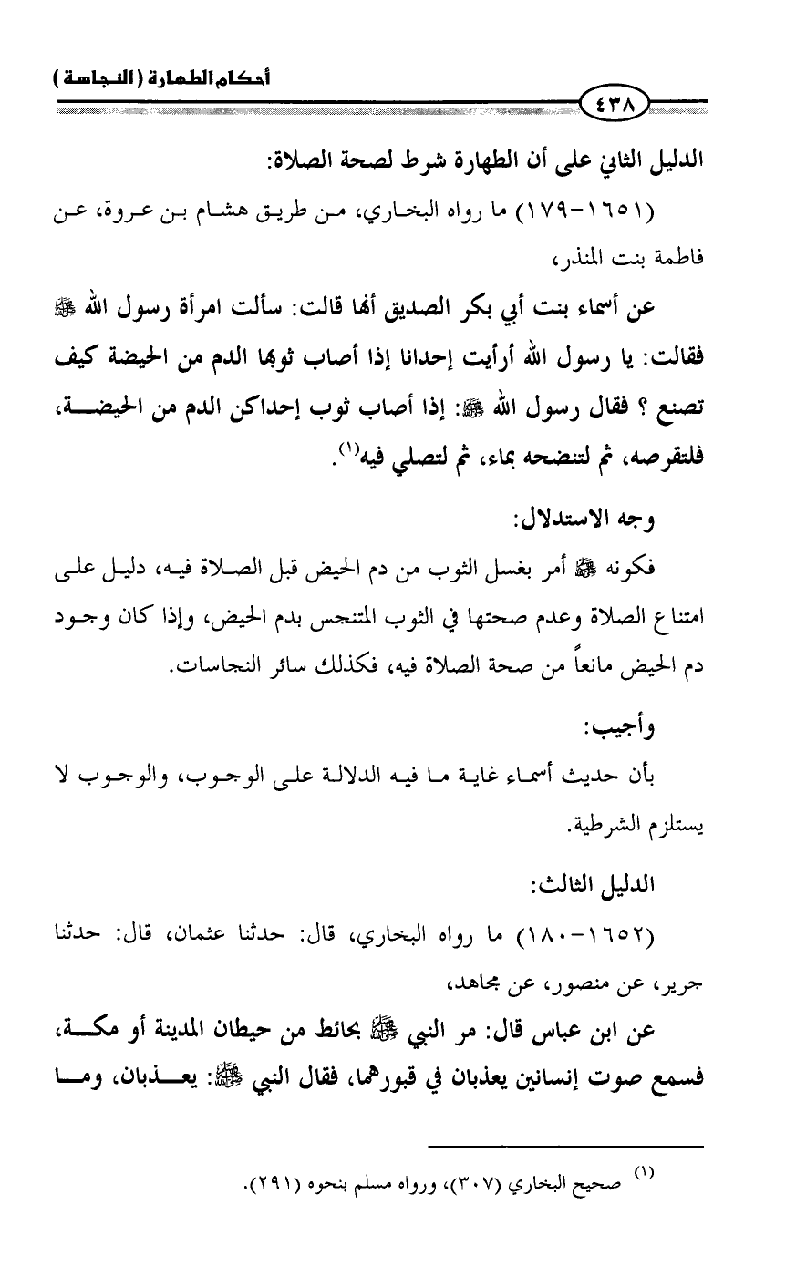 فكونه - صلى الله عليه وسلم - أمر بغسل الثوب من دم الحيض قبل الصلاة فيه، دليل على امتناع الصلاة وعدم صحتها في الثوب المتنجس بدم الحيض، وإذا كان وجود دم الحيض مانعاً من صحة الصلاة فيه، فكذلك سائر النجاسات.