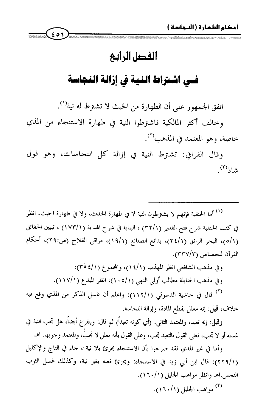 (¬1) أما الحنفية فإنهم لا يشترطون النية لا في طهارة الحدث، ولا في طهارة الخبث، انظر في كتب الحنفية شرح فتح القدير (1/ 32)، البناية في شرح الهداية (1/ 173)، تبيين الحقائق (1/ 5)، البحر الرائق (1/ 24)، بدائع الصنائع (1/ 19)، مراقي الفلاح (ص:29)، أحكام القرآن للجصاص (3/ 337).