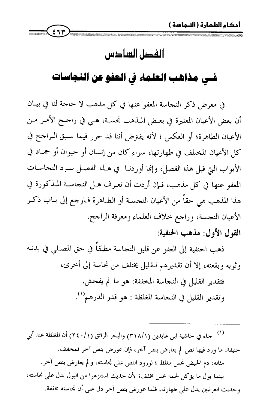 في معرض ذكر النجاسة المعفو عنها في كل مذهب لا حاجة لنا في بيان أن بعض الأعيان المعتبرة في بعض المذهب نجسة، هي في راجح الأمر من الأعيان الطاهرة؛ أو العكس؛ لأنه يفترض أننا قد حرر فيما سبق الراجح في كل الأعيان المختلف في طهارتها، سواء كان من إنسان أو حيوان أو جماد في الأبواب التي قبل هذا الفصل، وإنما أوردنا في هذا الفصل سرد النجاسات المعفو عنها في كل مذهب، فإن أردت أن تعرف هل النجاسة المذكورة في هذا المذهب هي حقاً من الأعيان النجسة أو الطاهرة فارجع إلى باب ذكر الأعيان النجسة، وراجع خلاف العلماء ومعرفة الراجح.