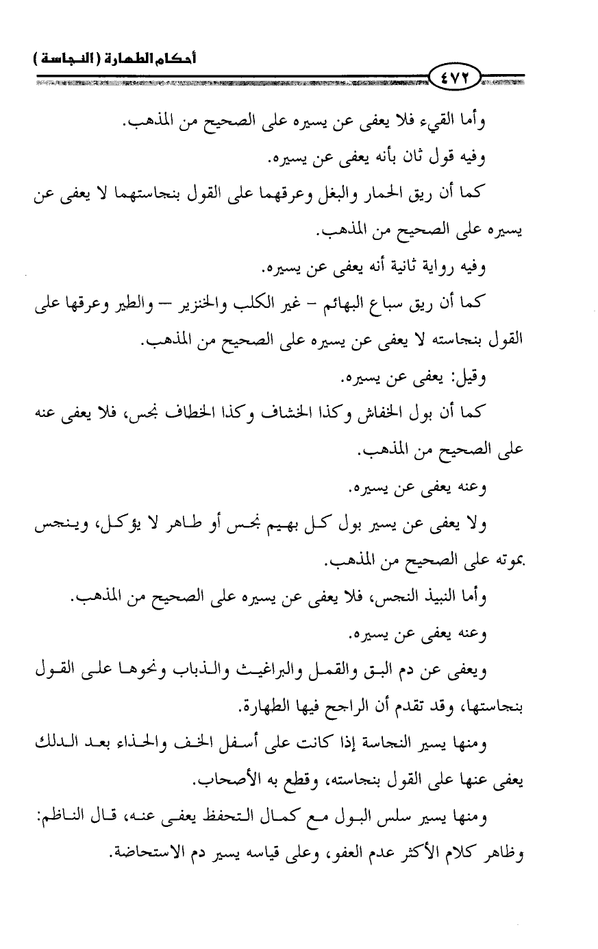 ومنها يسير سلس البول مع كمال التحفظ يعفى عنه، قال الناظم: وظاهر كلام الأكثر عدم العفو، وعلى قياسه يسير دم الاستحاضة.
