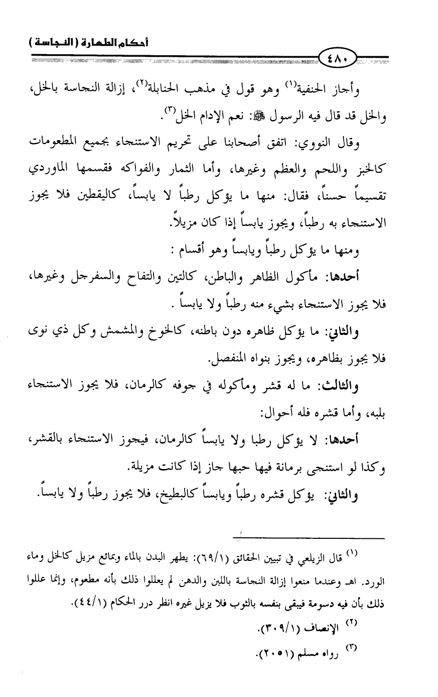 وقال النووي: اتفق أصحابنا على تحريم الاستنجاء بجميع المطعومات كالخبز واللحم والعظم وغيرها, وأما الثمار والفواكه فقسمها الماوردي تقسيماً حسناً، فقال: منها ما يؤكل رطباً لا يابساً, كاليقطين فلا يجوز الاستنجاء به رطباً، ويجوز يابساً إذا كان مزيلاً.