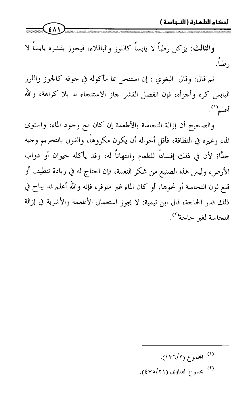 ثم قال: وقال البغوي: إن استنجى بما مأكوله في جوفه كالجوز واللوز اليابس كره وأجزأه, فإن انفصل القشر جاز الاستنجاء به بلا كراهة, والله أعلم (¬1).