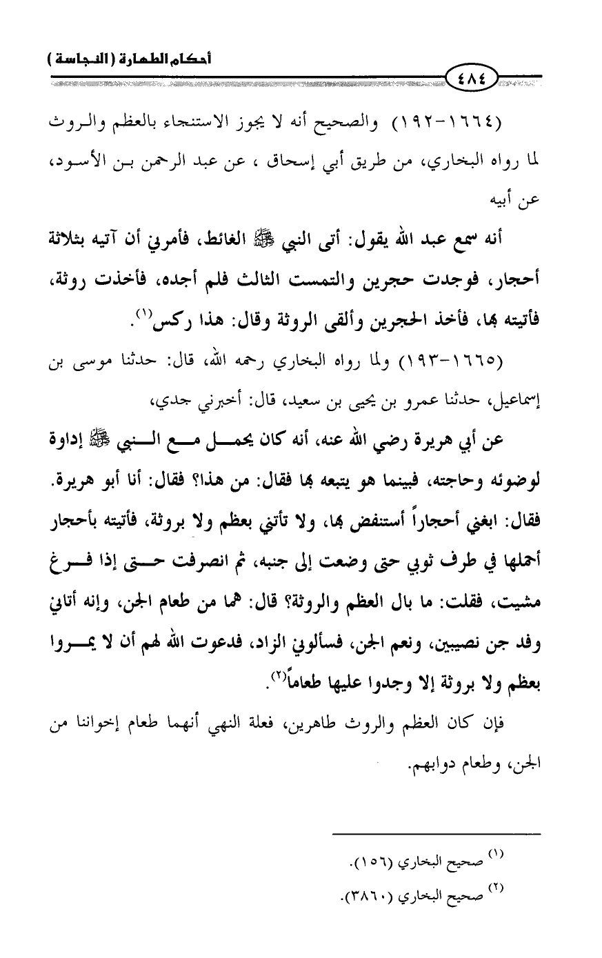 (1664 - 192) والصحيح أنه لا يجوز الاستنجاء بالعظم والروث لما رواه البخاري، من طريق أبي إسحاق، عن عبد الرحمن بن الأسود، عن أبيه