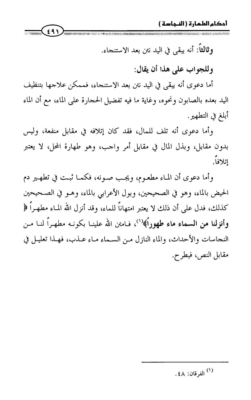 وأما دعوى أن الماء مطعوم، ويجب صونه، فكما ثبت في تطهير دم الحيض بالماء، وهو في الصحيحين، وبول الأعرابي بالماء، وهو في الصحيحين كذلك، فدل على أن ذلك لا يعتبر امتهاناً للماء، وقد أنزل الله الماء مطهراً {وأنزلنا من السماء ماء طهوراً} (¬1)، فامتن الله علينا بكونه مطهراً لنا من النجاسات والأحداث، والماء النازل من السماء ماء عذب، فهذا تعليل في مقابل النص، فيطرح.