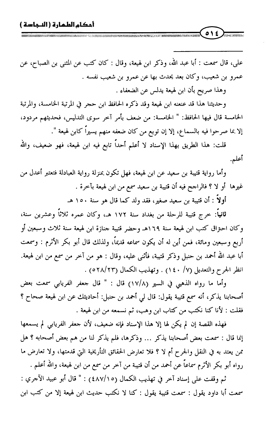 ثم وقفت على إسناد آخر في تهذيب الكمال (15/ 487): " قال أبو عبيد الآجري: سمعت أبا داود يقول: سمعت قتيبة يقول: كنا لا نكتب حديث ابن لهيعة إلا من كتب ابن =