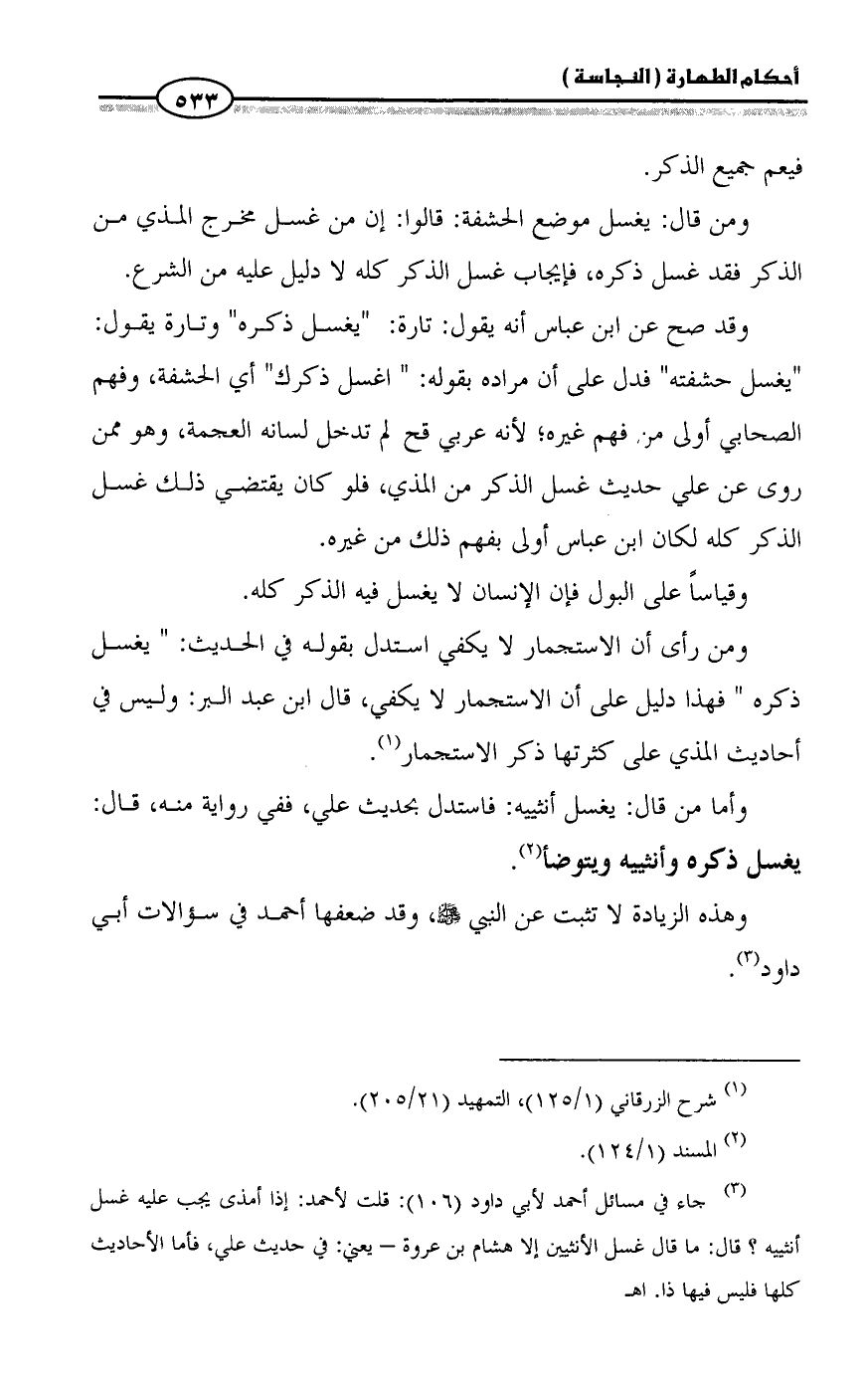 (¬3) جاء في مسائل أحمد لأبي داود (106): قلت لأحمد: إذا أمذى يجب عليه غسل أنثييه؟ قال: ما قال غسل الأنثيين إلا هشام بن عروة - يعني: في حديث علي، فأما الأحاديث كلها فليس فيها ذا. اهـ