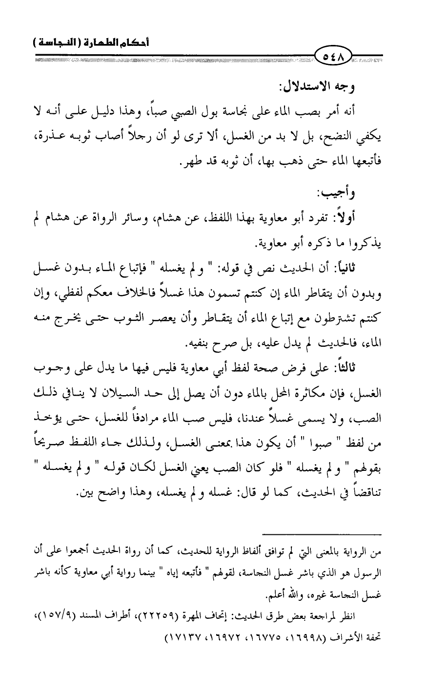 ثالثاً: على فرض صحة لفظ أبي معاوية فليس فيها ما يدل على وجوب الغسل، فإن مكاثرة المحل بالماء دون أن يصل إلى حد السيلان لا ينافي ذلك الصب، ولا يسمى غسلاً عندنا، فليس صب الماء مرادفاً للغسل، حتى يؤخذ من لفظ " صبوا " أن يكون هذا بمعنى الغسل، ولذلك جاء اللفظ صريحاً بقولهم " ولم يغسله " فلو كان الصب يعني الغسل لكان قوله " ولم يغسله " تناقضاً في الحديث، كما لو قال: غسله ولم يغسله، وهذا واضح بين.