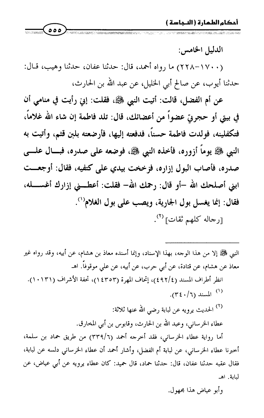 (1700 - 228) ما رواه أحمد، قال: حدثنا عفان، حدثنا وهيب، قال: حدثنا أيوب، عن صالح أبي الخليل، عن عبد الله بن الحارث،