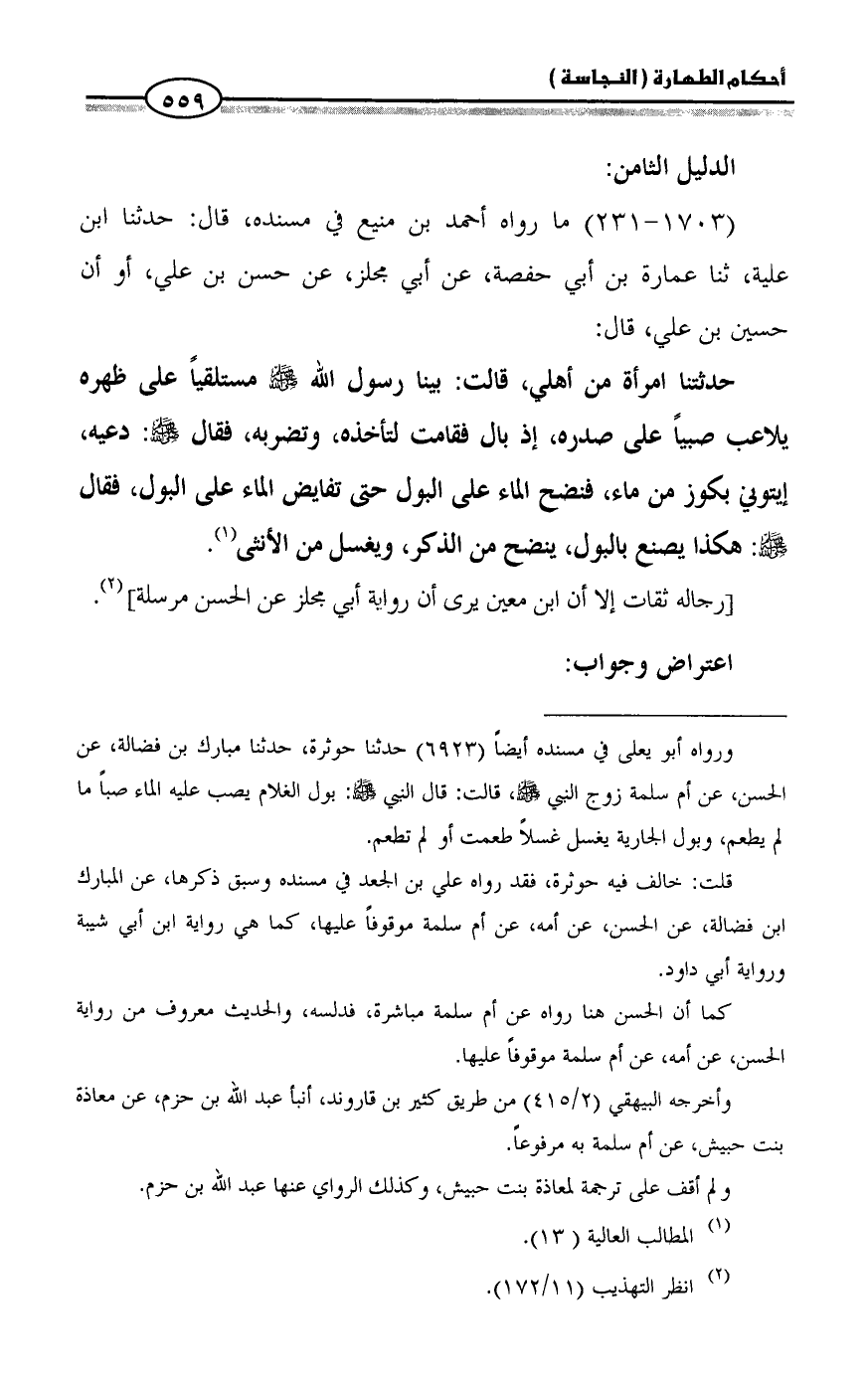 = ورواه أبو يعلى في مسنده أيضاً (6923) حدثنا حوثرة، حدثنا مبارك بن فضالة، عن الحسن، عن أم سلمة زوج النبي - صلى الله عليه وسلم -، قالت: قال النبي - صلى الله عليه وسلم -: بول الغلام يصب عليه الماء صباً ما لم يطعم، وبول الجارية يغسل غسلاً طعمت أو لم تطعم.