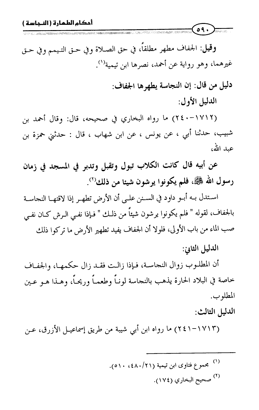 وقيل: الجفاف مطهر مطلقاً، في حق الصلاة وفي حق التيمم وفي حق غيرهما، وهو رواية عن أحمد، نصرها ابن تيمية (¬1).