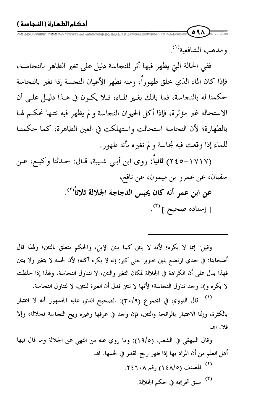 عن ابن عمر أنه كان يحبس الدجاجة الجلالة ثلاثاً (¬2).