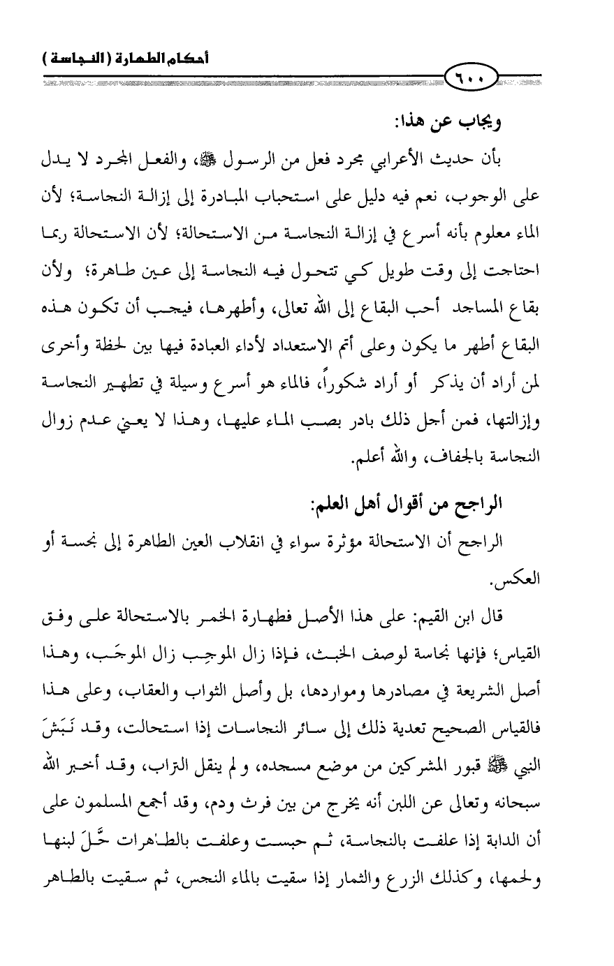 قال ابن القيم: على هذا الأصل فطهارة الخمر بالاستحالة على وفق القياس؛ فإنها نجاسة لوصف الخبث، فإذا زال الموجِب زال الموجَب، وهذا أصل الشريعة في مصادرها ومواردها، بل وأصل الثواب والعقاب، وعلى هذا فالقياس الصحيح تعدية ذلك إلى سائر النجاسات إذا استحالت، وقد نَبَشَ النبي - صلى الله عليه وسلم - قبور المشركين من موضع مسجده، ولم ينقل التراب، وقد أخبر الله سبحانه وتعالى عن اللبن أنه يخرج من بين فرث ودم، وقد أجمع المسلمون على أن الدابة إذا علفت بالنجاسة، ثم حبست وعلفت بالطاهرات حَّلَ لبنها ولحمها، وكذلك الزرع والثمار إذا سقيت بالماء النجس، ثم سقيت بالطاهر