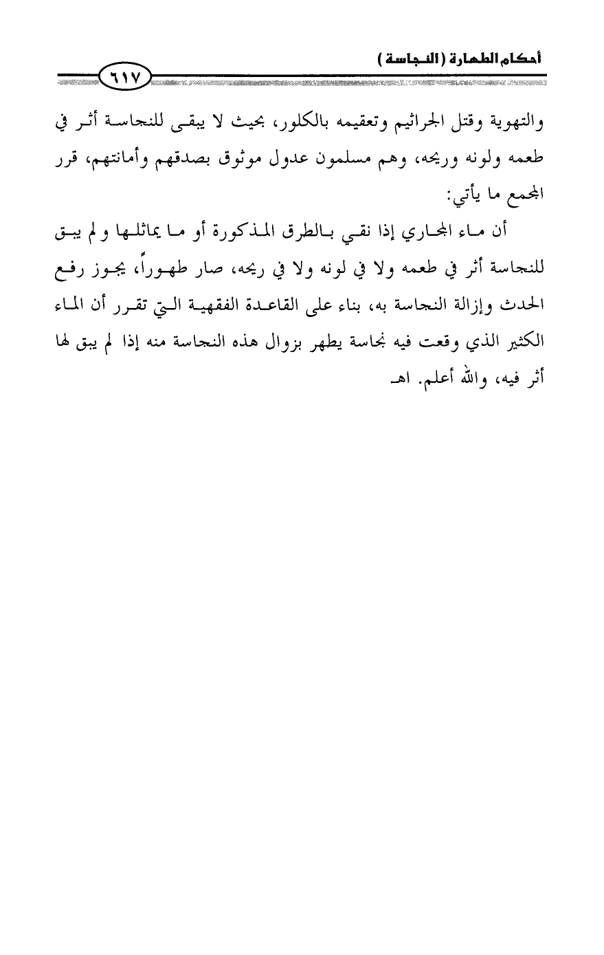 والتهوية وقتل الجراثيم وتعقيمه بالكلور، بحيث لا يبقى للنجاسة أثر في طعمه ولونه وريحه، وهم مسلمون عدول موثوق بصدقهم وأمانتهم، قرر المجمع ما يأتي: