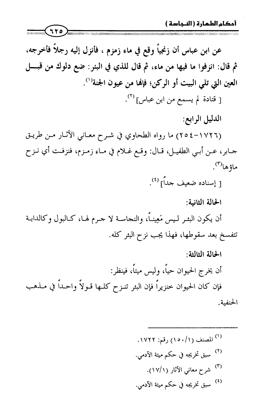 (1726 - 254) ما رواه الطحاوي في شرح معاني الآثار من طريق جابر، عن أبي الطفيل، قال: وقع غلام في ماء زمزم، فنزفت أي نزح ماؤها (¬3).