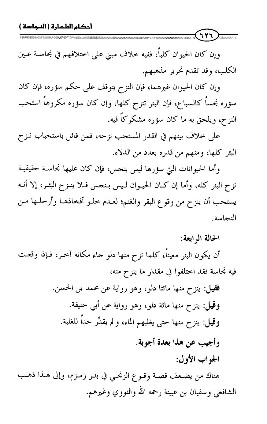 وأما الحيوانات التي سؤرها ليس بنجس، فإن كان عليها نجاسة حقيقية نزح البئر كله، وأما إن كان الحيوان ليس بنجس فلا ينزح البئر، إلا أنه يستحب أن ينزح من وقوع البقر والغنم؛ لعدم خلو أفخاذها وأرجلها من النجاسة.