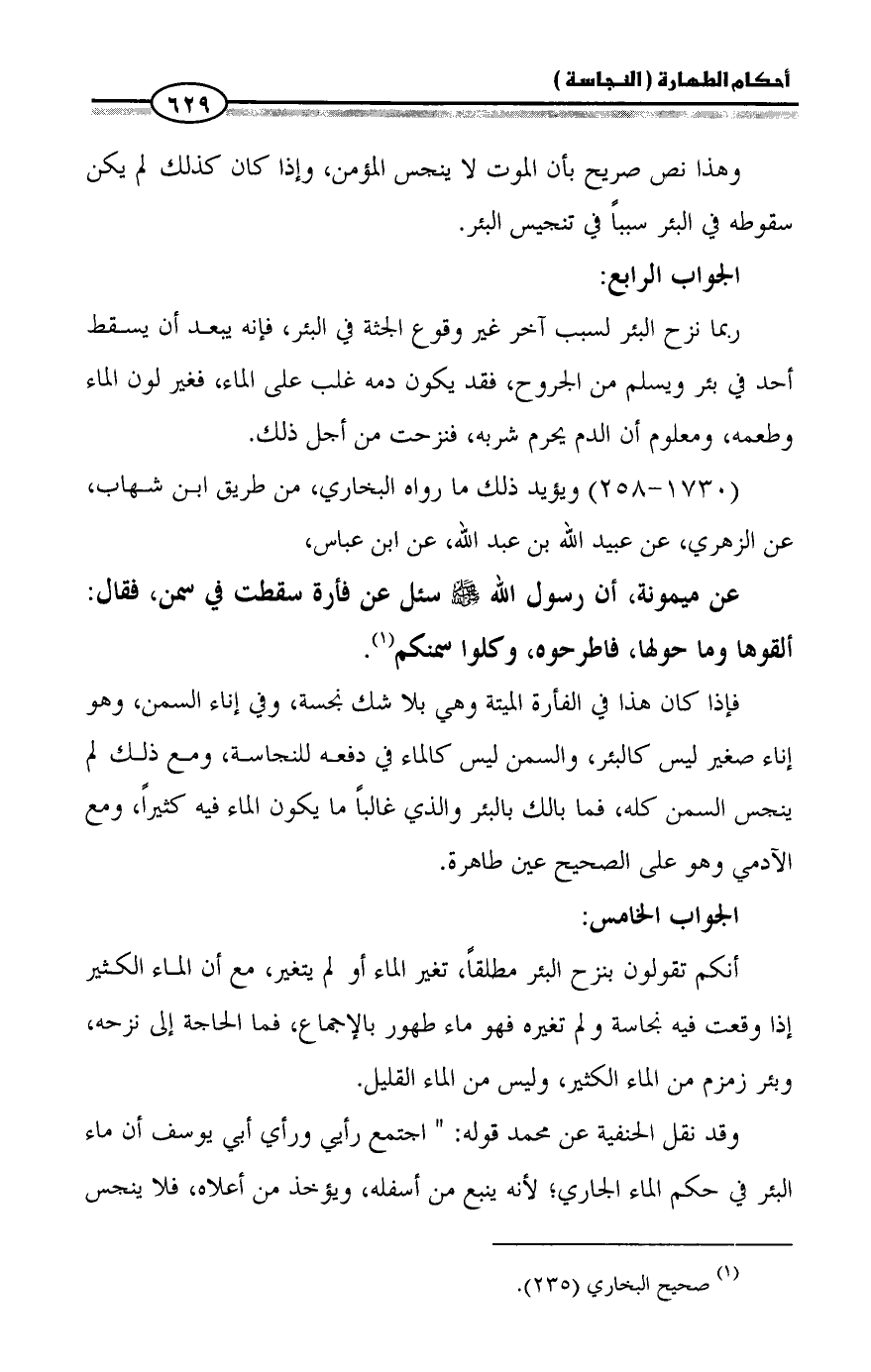 فإذا كان هذا في الفأرة الميتة وهي بلا شك نجسة، وفي إناء السمن، وهو إناء صغير ليس كالبئر، والسمن ليس كالماء في دفعه للنجاسة، ومع ذلك لم ينجس السمن كله، فما بالك بالبئر والذي غالباً ما يكون الماء فيه كثيراً، ومع الآدمي وهو على الصحيح عين طاهرة.