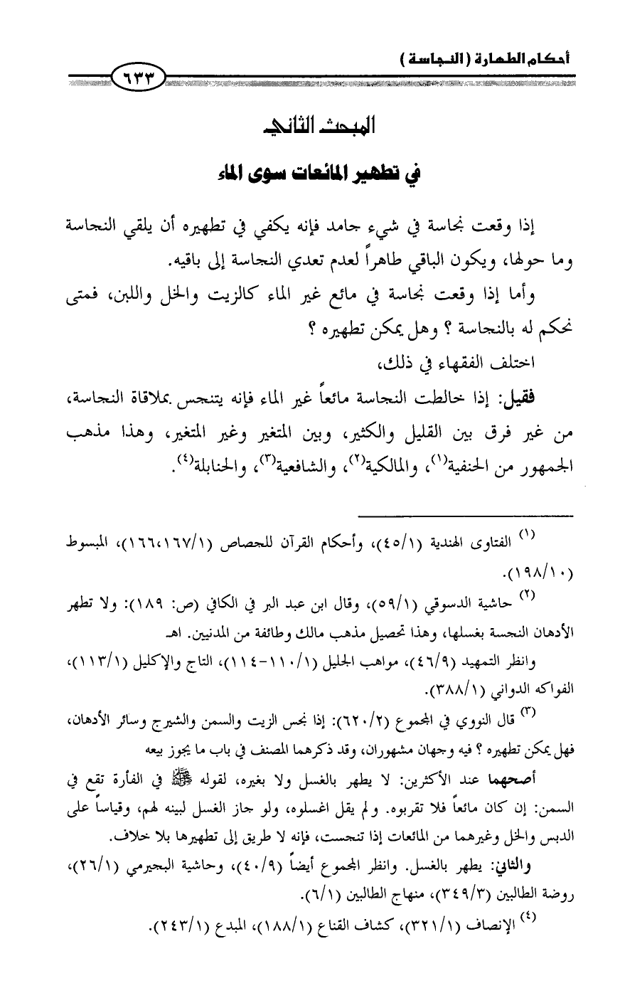 (¬2) حاشية الدسوقي (1/ 59)، وقال ابن عبد البر في الكافي (ص: 189): ولا تطهر الأدهان النجسة بغسلها، وهذا تحصيل مذهب مالك وطائفة من المدنيين. اهـ