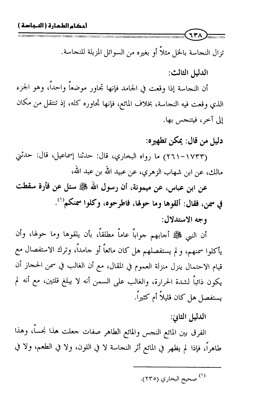 أن النبي - صلى الله عليه وسلم - أجابهم جواباً عاماً مطلقاً، بأن يلقوها وما حولها، وأن يأكلوا سمنهم، ولم يستفصلهم هل كان مائعاً أو جامداً، وترك الاستفصال مع قيام الاحتمال ينزل منزلة العموم في المقال، مع أن الغالب في سمن الحجاز أن يكون ذائباً لشدة الحرارة، والغالب على السمن أنه لا يبلغ قلتين، مع أنه لم يستفصل هل كان قليلاً أم كثيراً.