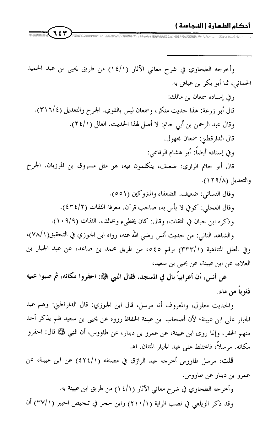 والحديث معلول، والمعروف أنه مرسل، قال ابن الجوزي: قال الدارقطني: وهم عبد الجبار على ابن عيينة؛ لأن أصحاب ابن عيينة الحفاظ رووه عن يحيى بن سعيد فلم يذكر أحد منهم الحفر، وإنما روى ابن عيينة، عن عمرو بن دينار، عن طاووس، أن النبي - صلى الله عليه وسلم - قال: احفروا مكانه. مرسلاً، فاختلط على عبد الجبار المتنان. اهـ