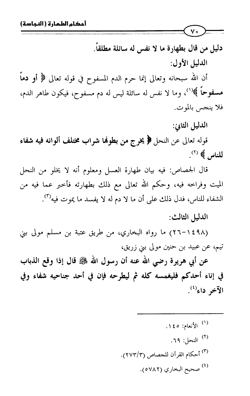 قال الجصاص: فيه بيان طهارة العسل ومعلوم أنه لا يخلو من النحل الميت وفراخه فيه, وحكم الله تعالى مع ذلك بطهارته فأخبر عما فيه من الشفاء للناس, فدل ذلك على أن ما لا دم له لا يفسد ما يموت فيه (¬3).