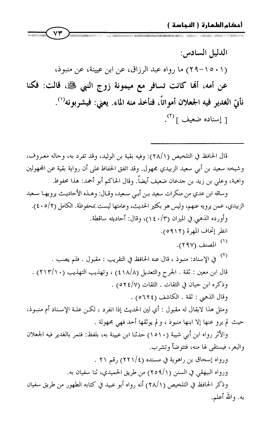 عن أمه، أنها كانت تسافر مع ميمونة زوج النبي - صلى الله عليه وسلم -، قالت: فكنا نأتي الغدير فيه الجعلان أمواتاً، فنأخذ منه الماء. يعني: فيشربونه (¬1).