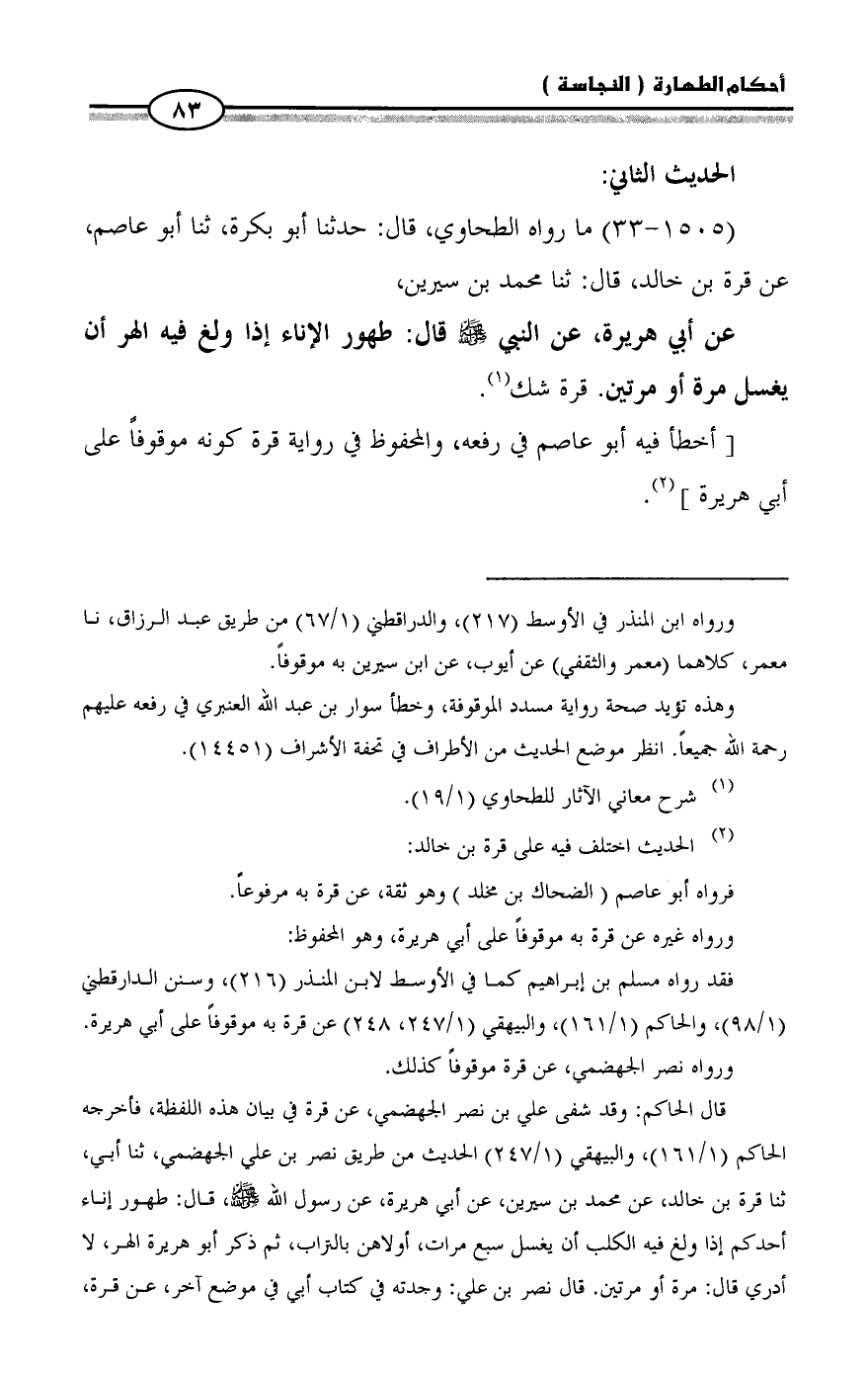 (1505 - 33) ما رواه الطحاوي، قال: حدثنا أبو بكرة، ثنا أبو عاصم، عن قرة بن خالد، قال: ثنا محمد بن سيرين،