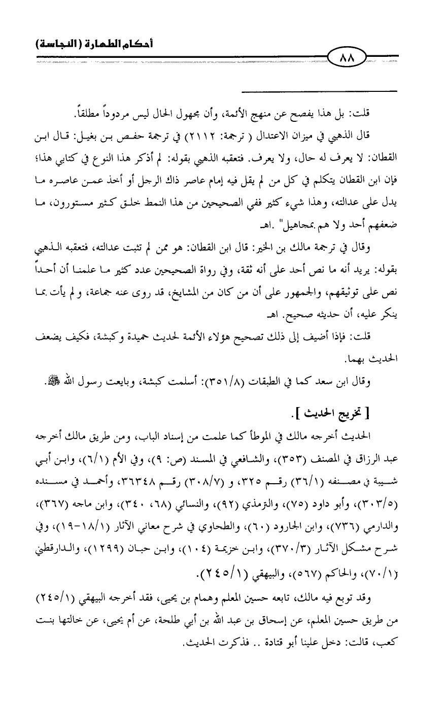 وقال في ترجمة مالك بن الخير: قال ابن القطان: هو ممن لم تثبت عدالته، فتعقبه الذهبي بقوله: يريد أنه ما نص أحد على أنه ثقة، وفي رواة الصحيحين عدد كثير ما علمنا أن أحداً نص على توثيقهم، والجمهور على أن من كان من المشايخ، قد روى عنه جماعة، ولم يأت بما ينكر عليه، أن حديثه صحيح. اهـ