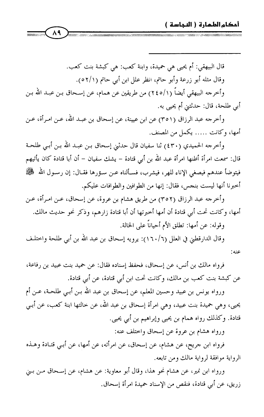 ورواه يونس بن عبيد وحسين المعلم، عن إسحاق بن عبد الله بن أبي طلحة، عن أم يحيى، وهي حميدة بنت عبيد، وهي امرأة إسحاق بن عبد الله، عن خالتها ابنة كعب، عن أبي قتادة. وكذلك رواه همام بن يحيى وإبراهيم بن أبي يحيى.
