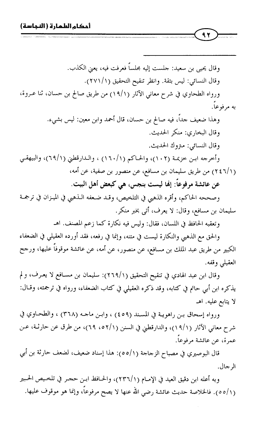 وبه أعله ابن دقيق العيد في الإمام (1/ 236)، والحافظ ابن حجر في تلخيص الحبير (1/ 55). فالخلاصة حديث عائشة رضي الله عنها لا يصح مرفوعاً، وإنما هو موقوف عليها. =