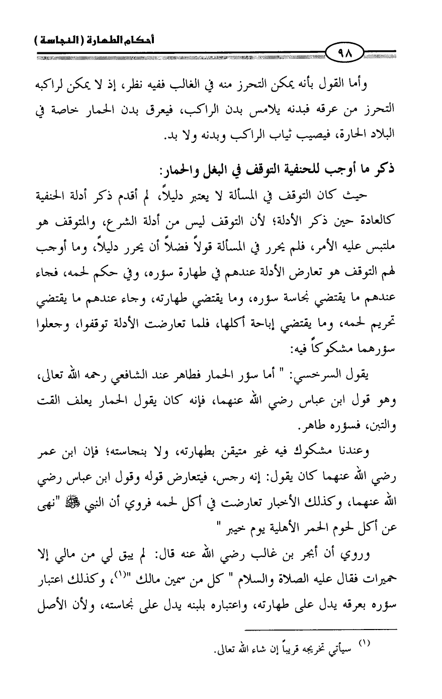 وأما القول بأنه يمكن التحرز منه في الغالب ففيه نظر، إذ لا يمكن لراكبه التحرز من عرقه فبدنه يلامس بدن الراكب، فيعرق بدن الحمار خاصة في البلاد الحارة، فيصيب ثياب الراكب وبدنه ولا بد.