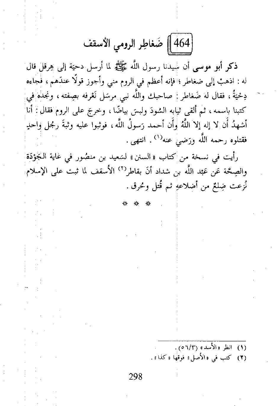 ذكر أبو موسى أن سيدنا رسول الله - صلى الله عليه وسلم - لما أرسل دحيَة إلى هِرقل قال له: اذهبْ إلى ضغاطر؛ فإنه أعظم فِي الروم مني وأجوز قولًا عندَهم، فجاءه دِحْيَةُ، فقال له ضَغاطر: صاحبك والله نبي مرسَل نَعْرفه بصفته، ونجده فِي كتبنا باسمه، ثم ألقى ثيابه السُودَ ولبسَ بياضًا، وخرجَ على الروم فقال: أنا أشهدُ أَن لا إله إلا اللهُ وأَن أحمد رَسولُ اللَّه، فوثبوا عليه وثبةَ رجُل واحدٍ فقتلوه رحمه الله ورَضي عنه (¬1). انتهى.
