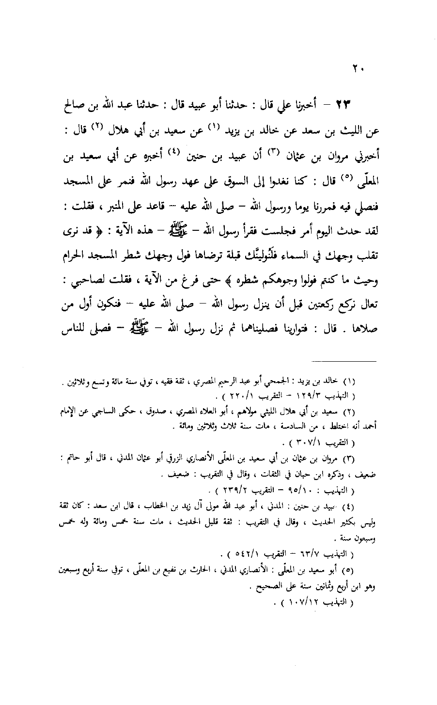 23 - حَدَّثَنَا أَبُو عُبَيْدٍ قَالَ: حَدَّثَنَا عَبْدُ اللَّهِ بْنُ صَالِحٍ، عَنِ اللَّيْثِ بْنِ سَعْدٍ، عَنْ خَالِدِ بْنِ يَزِيدَ، عَنْ سَعِيدِ بْنِ أَبِي هِلَالٍ قَالَ: أَخْبَرَنِي مَرْوَانُ بْنُ عُثْمَانَ، أَنَّ عُبَيْدَ بْنَ حُنَيْنٍ، أَخْبَرَهُ، عَنْ أَبِي سَعِيدِ بْنِ الْمُعَلَّى قَالَ: كُنَّا نَغْدُوا إِلَى السُّوقِ عَلَى عَهْدِ رَسُولِ اللَّهِ، فَنَمُرُّ عَلَى الْمَسْجِدِ، فَنُصَلِّي فِيهِ، فَمَرَرْنَا يَوْمًا وَرَسُولُ اللَّهِ صَلَّى اللَّهُ عَلَيْهِ قَاعِدٌ عَلَى الْمِنْبَرِ، فَقُلْتُ: لَقَدْ حَدَثَ الْيَوْمَ أَمْرٌ، فَجَلَسْتُ، فَقَرَأَ رَسُولُ اللَّهِ صَلَّى اللهُ عَلَيْهِ وَسَلَّمَ هَذِهِ الْآيَةَ: {قَدْ نَرَى تَقَلُّبَ وَجْهِكَ فِي السَّمَاءِ، فَلَنُوَلِّيَنَّكَ قِبْلَةً تَرْضَاهَا، فَوَلِّ وَجْهَكَ شَطْرَ الْمَسْجِدِ الْحَرَامِ وَحَيْثُمَا كُنْتُمْ فَوَلُّوا وُجُوهَكُمْ شَطْرَهُ}، حَتَّى فَرَغَ مِنَ الْآيَةِ، فَقُلْتُ لِصَاحِبِي: §تَعَالَ نَرْكَعْ رَكْعَتَيْنِ قَبْلَ أَنْ يَنْزِلَ رَسُولُ اللَّهِ صَلَّى اللَّهُ عَلَيْهِ فَنَكُونَ أَوَّلَ مَنْ صَلَّاهَا، قَالَ: فَتَوَارَيْنَا فَصَلَّيْنَاهُمَا، «ثُمَّ نَزَلَ رَسُولُ اللَّهِ صَلَّى اللهُ عَلَيْهِ وَسَلَّمَ فَصَلَّى لِلنَّاسِ -[21]- الظُّهْرَ يَوْمَئِذٍ» قَالَ أَبُو عُبَيْدٍ: فَهَذَا مَا فِي الصَّلَاةِ مِنْ نَسْخِ الْقُرْآنِ فَأَمَّا نَسْخُهَا فِي السُّنَّةِ