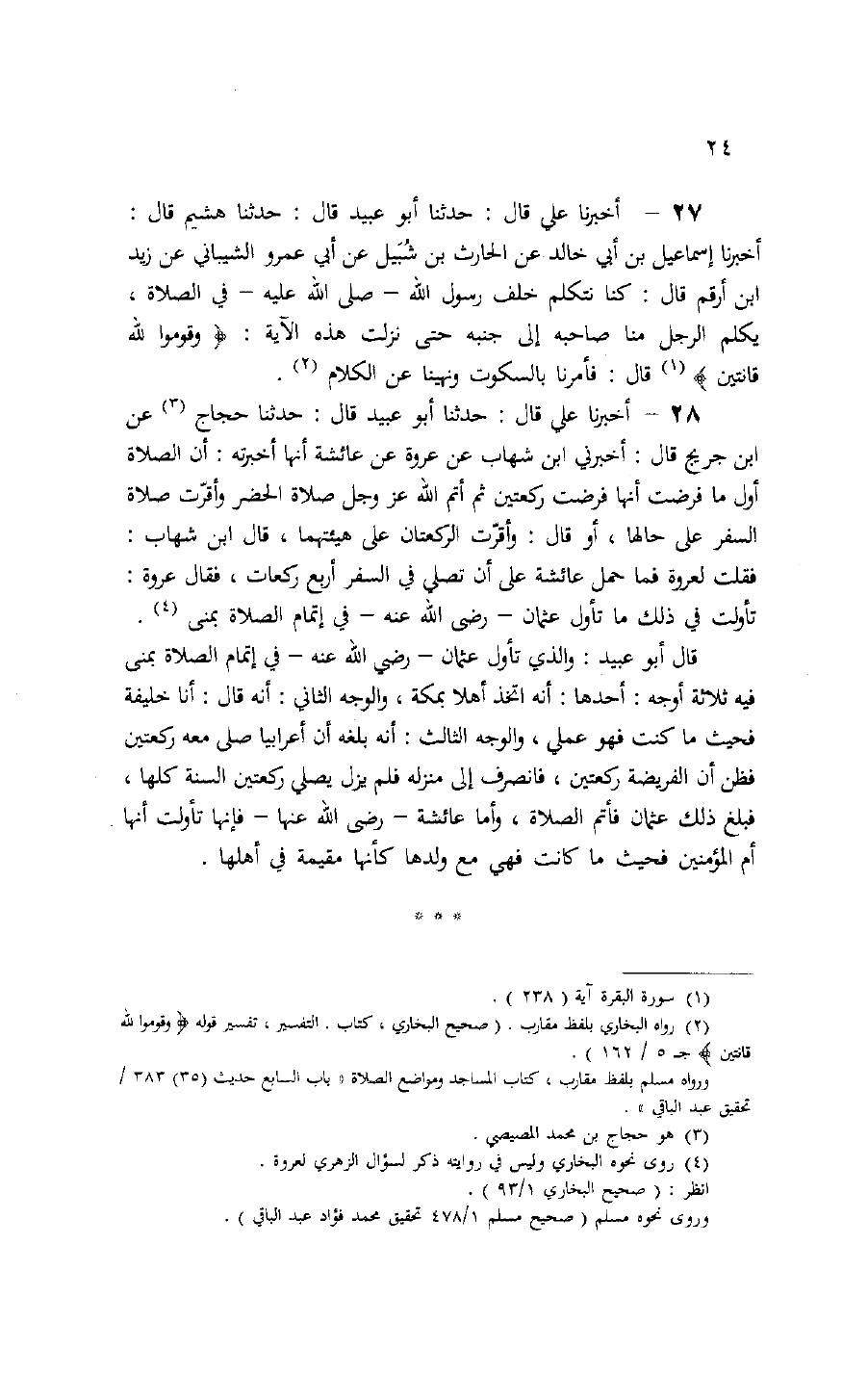 27 - حَدَّثَنَا أَبُو عُبَيْدٍ قَالَ: حَدَّثَنَا هُشَيْمٌ قَالَ: أَخْبَرَنَا إِسْمَاعِيلُ بْنُ أَبِي خَالِدٍ، عَنِ الْحَارِثِ بْنِ شُبَيْلٍ، عَنْ أَبِي عَمْرٍو الشَّيْبَانِيِّ، عَنْ زَيْدِ بْنِ أَرْقَمَ قَالَ: كُنَّا نَتَكَلَّمُ خَلْفَ رَسُولِ اللَّهِ صَلَّى اللَّهُ عَلَيْهِ فِي الصَّلَاةِ، يُكَلِّمُ الرَّجُلُ مِنَّا صَاحِبَهُ إِلَى جَنْبِهِ حَتَّى نَزَلَتْ هَذِهِ الْآيَةُ: {§وَقُومُوا لِلَّهِ قَانِتِينَ} [البقرة: 238] قَالَ: «فَأُمِرْنَا بِالسُّكُوتِ وَنُهِينَا عَنِ الْكَلَامِ»