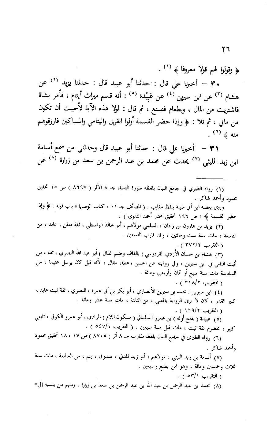 30 - حَدَّثَنَا أَبُو عُبَيْدٍ قَالَ: حَدَّثَنَا يَزِيدُ، عَنْ هِشَامٍ، عَنِ ابْنِ سِيرِينَ، عَنْ عَبِيدَةَ أَنَّهُ " §قَسَمَ مِيرَاثَ أَيْتَامٍ، فَأَمَرَ بِشَاةٍ، فَاشْتُرِيَتْ مِنَ الْمَالِ، وَبِطَعَامٍ فَصُنِعَ، ثُمَّ قَالَ: لَوْلَا هَذِهِ الْآيَةُ لَأَحْبَبْتُ أَنْ تَكُونَ مِنْ مَالِي، ثُمَّ تَلَا: {وَإِذَا حَضَرَ الْقِسْمَةَ أُولُو الْقُرْبَى وَالْيَتَامَى وَالْمَسَاكِينُ فَارْزُقُوهُمْ مِنْهُ} " أَخْبَرَنَا عَلِيٌّ قَالَ: حَدَّثَنَا أَبُو عُبَيْدٍ قَالَ: وَحَدَّثَنِي مَنْ، سَمِعَ أُسَامَةَ بْنَ زَيْدٍ اللَّيْثِيَّ، يُحَدِّثُ عَنْ مُحَمَّدِ بْنِ عَبْدِ الرَّحْمَنِ بْنِ سَعْدِ بْنِ زُرَارَةَ، عَنْ -[27]- عَمْرَةَ بِنْتِ عَبْدِ الرَّحْمَنِ، أَنَّ عَبْدَ اللَّهِ بْنَ عَبْدِ الرَّحْمَنِ بْنِ أَبِي بَكْرٍ، فَعَلَ مِثْلَ ذَلِكَ حِينَ قَسَمَ مِيرَاثَ أَبِيهِ، قَالَتْ: فَذَكَرْتُ ذَلِكَ لِعَائِشَةَ، فَقَالَتْ: عَمِلَ بِالْكِتَابِ، هِيَ لَمْ تُنْسَخْ